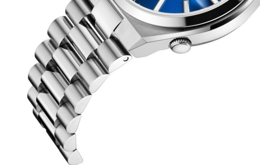 Brățara President, așadar, este o încrucișare între Oyster și Jubilee - este elegantă, dar compusă din doar trei verigi. Cu toate acestea, prin micșorarea verigilor, acestea sunt mult mai multe, iar întreaga construcție este într-un fel condensată (bombarea verigilor individuale contribuie, de asemenea, la impresia de condensare).