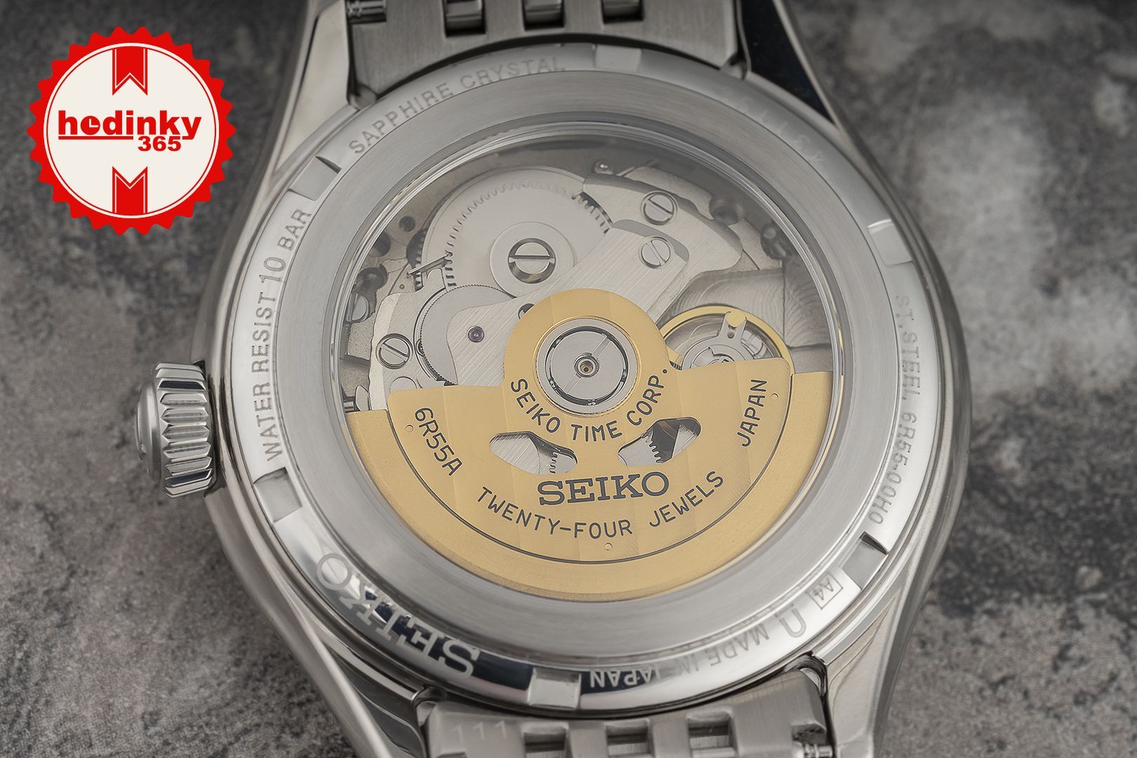 Mecanic cu înfășurare automată. Seiko 6R55, Rezerva de funcționare 72h, 21.600 BPH (3Hz), 24 pietre, Hacking, Posibilitatea de încărcare manuală